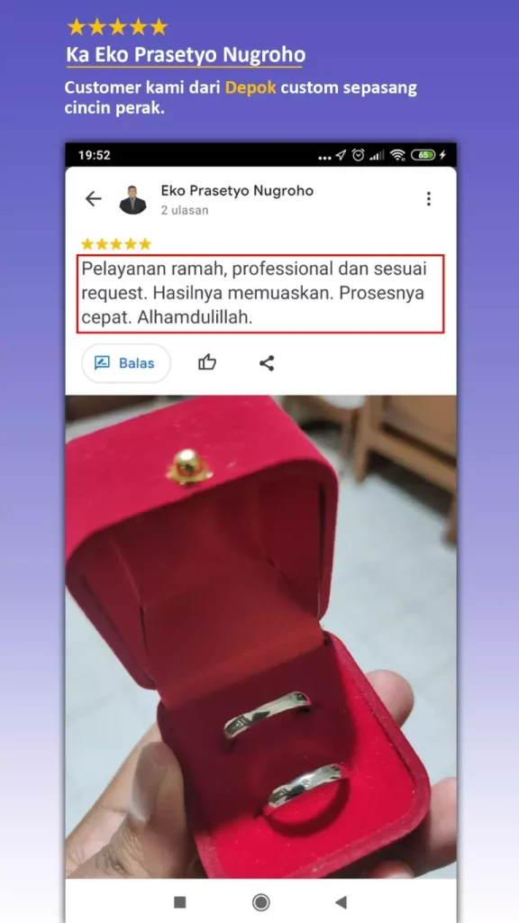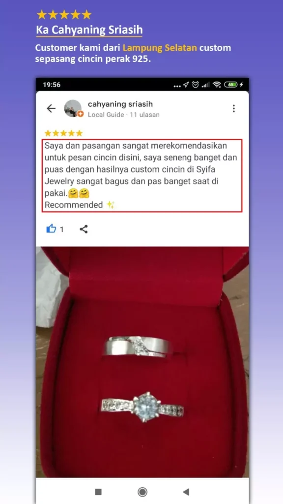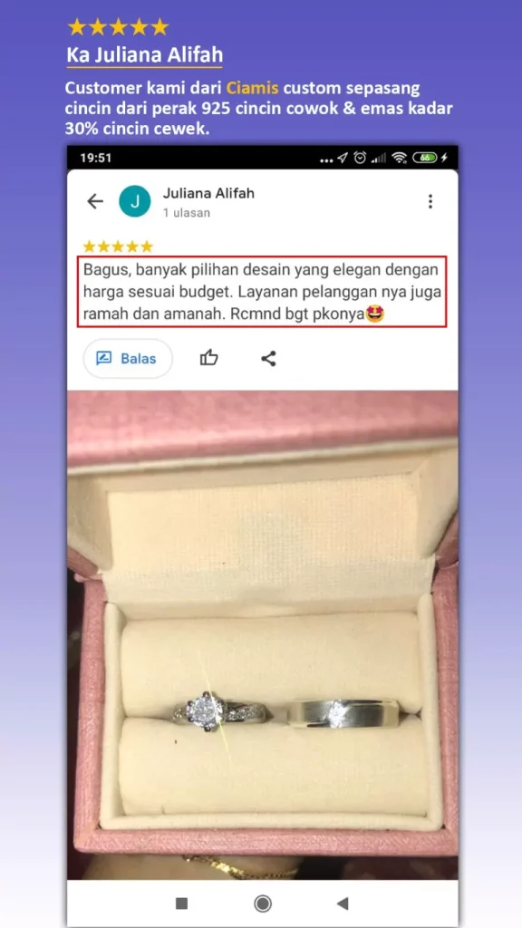 Kamu bisa custom cincin tanpa harus datang langsung ketoko dan ini sangat menghemat waktu dan Kamu bisa lebih pokus untuk persiapan pernikahan.