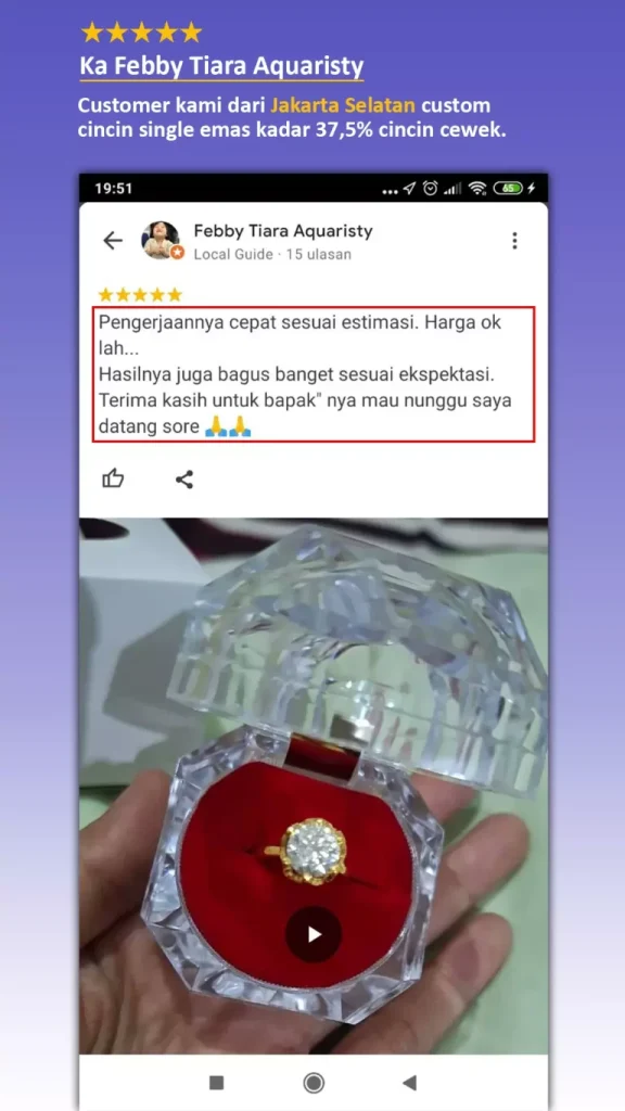 Kamu bisa memilih custom cincin jika budget kamu terbatas. Pengrajin/para ahli akan membantu Kamu untuk memberikan gambaran desain cincin dan bahan yang sesuai dengan budget Kamu.